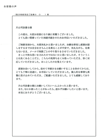大変お世話になり、有り難うございました。司法書士の先生という堅いイメージがありましたので緊張しましたが、片山先生はイメージが全く違い、とてもきさくで相談に乗って頂けました。私の都合を聞いて頂き、段取りがとても早く、メールでやり取りが出来たので、仕事を休む事なく、全ての手続きが完了しました。人生の中で一度は訪れる相続問題ですが、また機会がありましたら、是非、宜しくお願い致します。