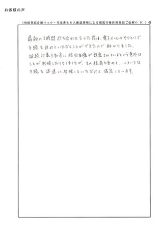 大変親身になってやっていただき、ありがとうございました。お陰様で、思ったより早く相続放棄も無事にすみました。